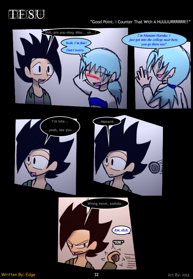 The one with boobs just went from cold and collected to ackward and flirty. To aviod the obvious questions this brings up something was thrown at someones face, a good tactic.